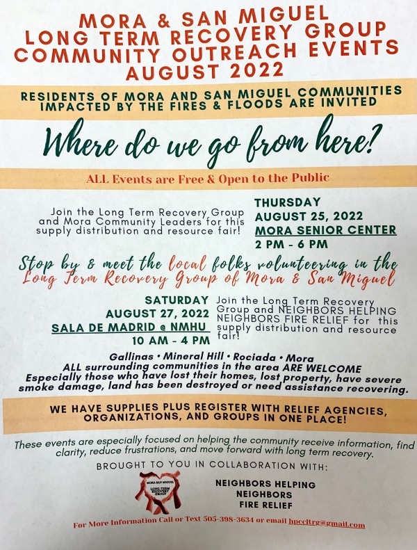 Have you been affected by the fire and flooding in the northern part of the state? This week there are activities in the Mora and San Miguel communities. See the flyer for more informaiton.